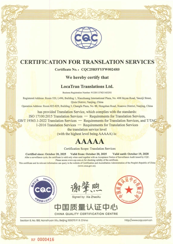 近日,南京瑞科翻译公司(以下简称“瑞科翻译”)顺利通过 ISO 17100:2015 国际翻译服务认证,并成功获得由中国翻译协会 (TAC) 授予的翻译服务 5A 级认证。该认证是国内翻译服务领域的最高等级资质,代表了语言服务企业在质量体系建设、专业交付能力和行业认可度上的权威水平。