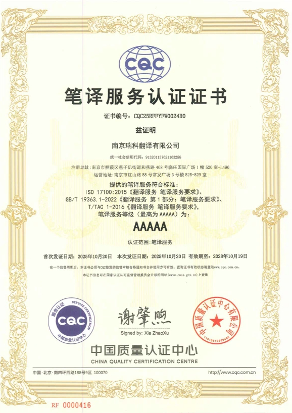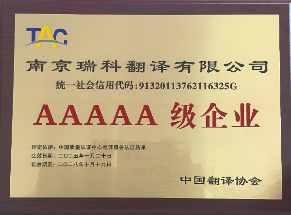 近日,南京瑞科翻译公司(以下简称“瑞科翻译”)顺利通过 ISO 17100:2015 国际翻译服务认证,并成功获得由中国翻译协会 (TAC) 授予的翻译服务 5A 级认证。该认证是国内翻译服务领域的最高等级资质,代表了语言服务企业在质量体系建设、专业交付能力和行业认可度上的权威水平。