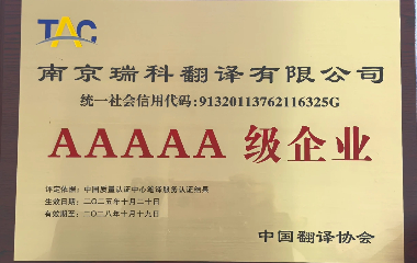 近日,南京瑞科翻译公司(以下简称“瑞科翻译”)顺利通过 ISO 17100:2015 国际翻译服务认证,并成功获得由中国翻译协会 (TAC) 授予的翻译服务 5A 级认证。该认证是国内翻译服务领域的最高等级资质,代表了语言服务企业在质量体系建设、专业交付能力和行业认可度上的权威水平。